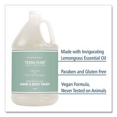 Elevate guest experience and embrace luxury and sustainability with the Terra Pure® Earth Conscious gallon collection. This premium quality hand and body wash is designed with care, and high performance. The refreshing hand and body wash delivers results guests will thoroughly enjoy with every use. Infused with the nourishing goodness of olive oil and aloe vera extract, it ensures soft, smooth and hydrated skin. The green tea and lemongrass fragrance adds an invigorating touch to guests' hygiene routine. Terra Pure® Hand & Body Wash is vegan-friendly, free from harsh chemicals, and packaged in a bottle made with recycled content. The convenient gallon bottle is designed to refill both wall-mounted and stand-alone dispensers, reducing waste and cultivating a sustainable mindset. This product is part of the EcoWell® Health and Wellbeing group, making this the perfect choice for guests.